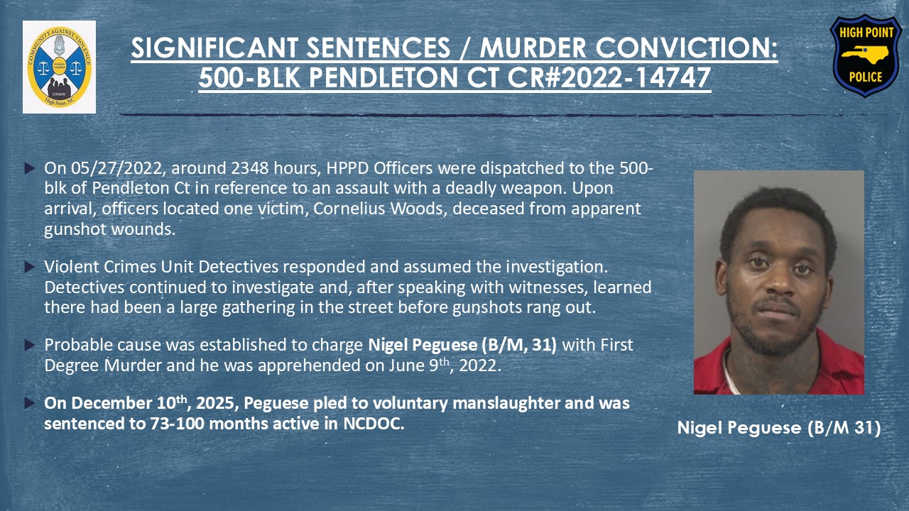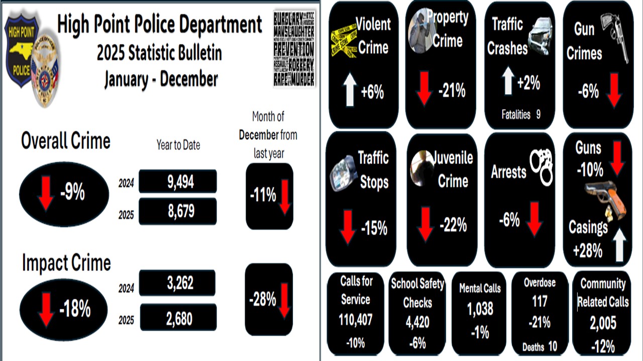 Each month the High Point Police Department shares the most recent data related to violent crimes, gang activity, gun seizures and other interactions with our community at the HPCAV monthly meeting. These meetings are always open to the public. The information below is from the January 14, 2026 meeting.